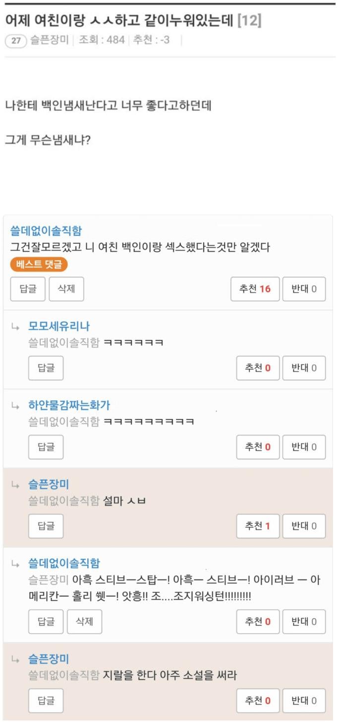 여친이 나한테 백인냄새가 난대.jpg 작성자 정보 맹구공 0 3365 2025.02.25 16:30 컨텐츠 정보 가+ 가- 목록 본문 ㅋㅋㅋㅋㅋㅋㅋㅋㅋㅋㅋㅋ 🔥 최근 인기글 🤣🤣🤣 SNS로 친구들에게 공유해서 같이 즐겨요~! 👇👇 관련자료 댓글 0 등록된 댓글이 없습니다. 로그인한 회원만 댓글 등록이 가능합니다. 목록