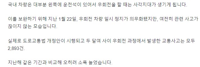 (우회전 일시정지 도입 뒤 사망자 2배 증가)이젠 횡단보도를 교차로에서 멀리 두는 방안이 해법이라고 나옴이건 운전자들이 우회전하기 전에 멈추고 보행자가 있는지 살피는 습관을 들라는건데...오히려 우회전 하자마자 횡단보도 있는게 더 위험한거 같음...시야 확보도 어렵고 신호등에 가려진 사람들도 있고...또 가끔은 전방 빨간불이라 정지했더니,,,파란불이여서 우회전하려고 하면 때마침 횡단보도 파란불 들어오는 경우도 있다고 함...이런 상황에서 사고라도 나면 운전자만 ㅈ되는거자나....저런 경우엔 경찰에 신호조정 민원 넣어야 한다고 하네요 ㅠㅠ진즉에 잘 좀 만들지...만들고 도입 늦게하든가