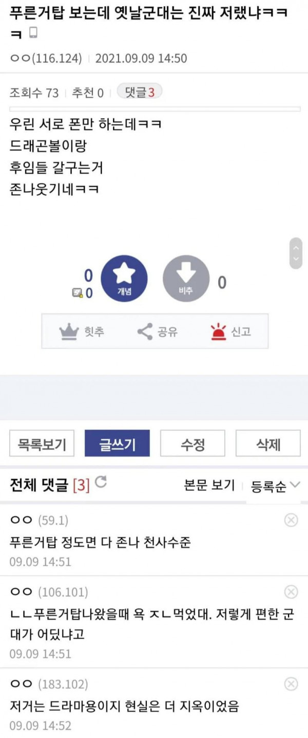 푸른거탑을 본 요즘 세대의 반응 작성자 정보 맹구 0 3922 2023.06.16 11:04 컨텐츠 정보 가+ 가- 목록 본문 🔥 최근 인기글 🤣🤣🤣 SNS로 친구들에게 공유해서 같이 즐겨요~! 👇👇 관련자료 댓글 0 등록된 댓글이 없습니다. 로그인한 회원만 댓글 등록이 가능합니다. 목록